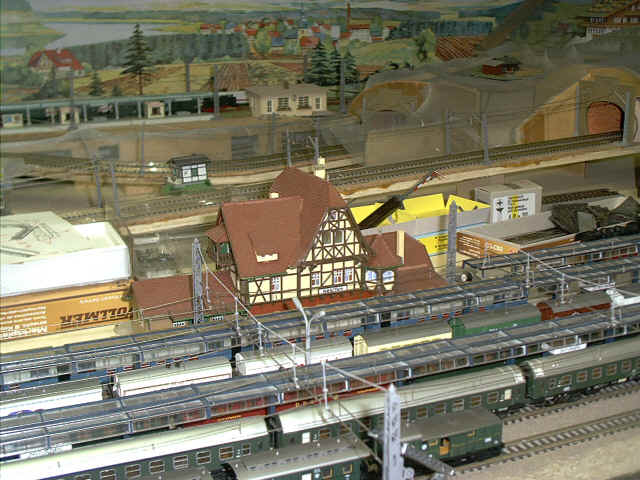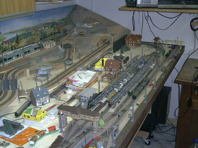 Aus Platzgründen habe ich mich für die Spurweite N entschieden. Außerdem hatte ich noch viel rollendes Material aus PIKO-Zeiten. Die Lokomotiven laufen zwar sehr schlecht auf den neuen Fleischmann-Gleisen und werden aus diesem Grund wohl nur das BW bevölkern. Aber die Wagen bekamen neue Achsen, mit denen sie jetzt auch gut über die Weichen kommen. Die Anlage hat eine Größe von 1,10m Tiefe * 2,10m Breite. Das Thema ist eine zweigleisige Hauptstrecke mit einem kleinen Bahnbetriebswerk und mit einem zweigleisigen Containerbahnhof in der rechten, vorderen Ecke. Auf eine bestimmte Epoche habe ich mich nicht festgelegt. Die Oberleitung wird nur im sichtbaren Bereich installiert, um auch mit entsprechenden Elektrolokomotiven arbeiten zu können.